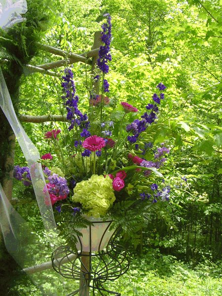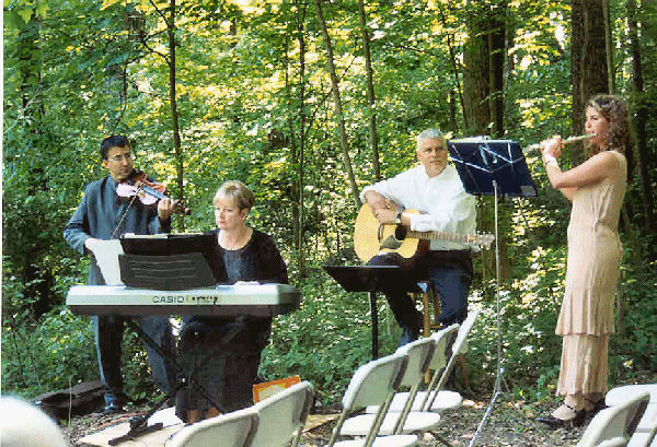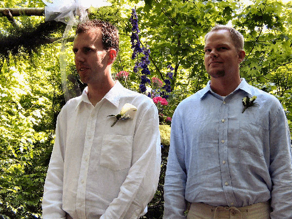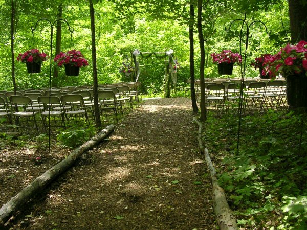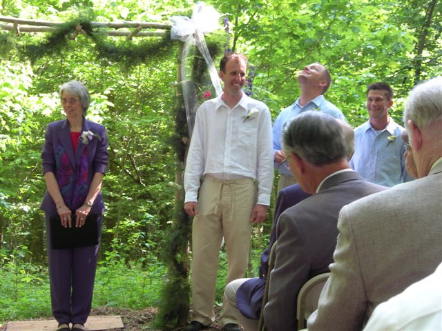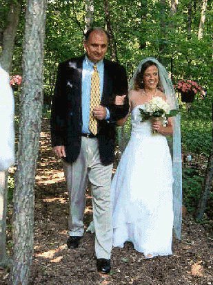 Kelley and Larry approach the wedding arbor