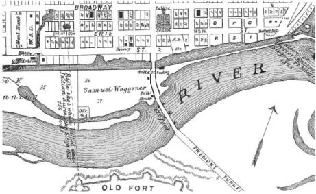 1875 map clearly shows the location of the 1849 bridge and its three