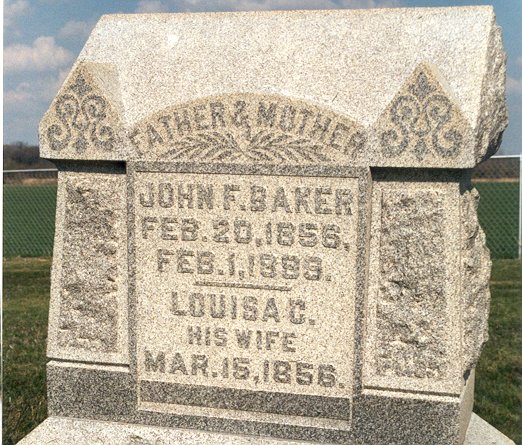 The earliest date appearing on a marker in the Baker Cemetery is on the grave of Angenetta Cobb, year-old daughter of Mr. and Mrs. Alonzo Cobb, who died in 1844. However, Mrs. Amanda Baker Huffman seems to remember that her grandmother, who was an Eckert, once told her that her brother, Winfield Eckert, was the first to be buried there. He was killed by a falling tree when he was just a young boy. He would have been a brother-in-law of the James Baker who gave the land.