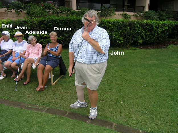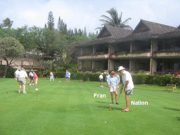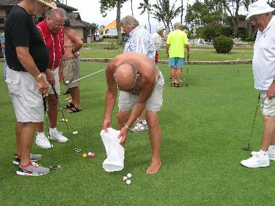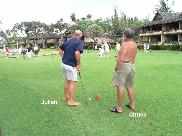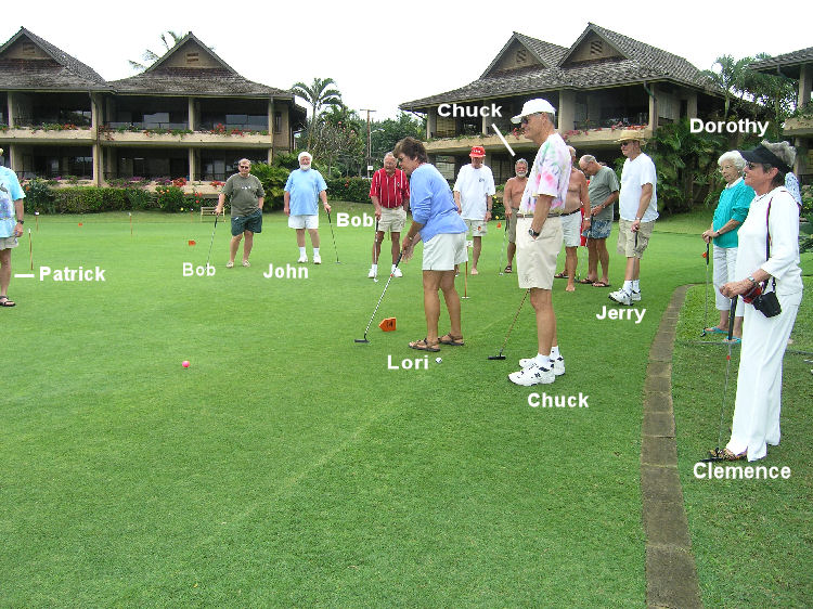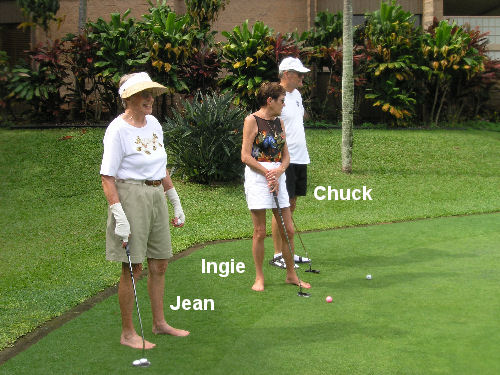 Every morning, promptly at 10:30 AM following coffee, the serious and not-so-serious putters gather at the putting green, their pockets awash in quarters. Will it be a "push" with everybody cheering when a tie cancels the winnings due the team scoring the highest number of aces? Or will some lucky trio or foursome take all? (all = 25¢ from each individual......it hurts!).