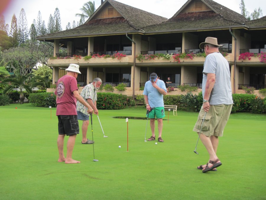 Every morning, promptly at 10:30 AM following coffee, the serious and not-so-serious putters gather at the putting green for three rounds, their pockets awash in quarters. Will it be a "push" (tie scores...no quarters due?) Or will some lucky (or possibly "skilled") trio or foursome collect quarters from everyone else?